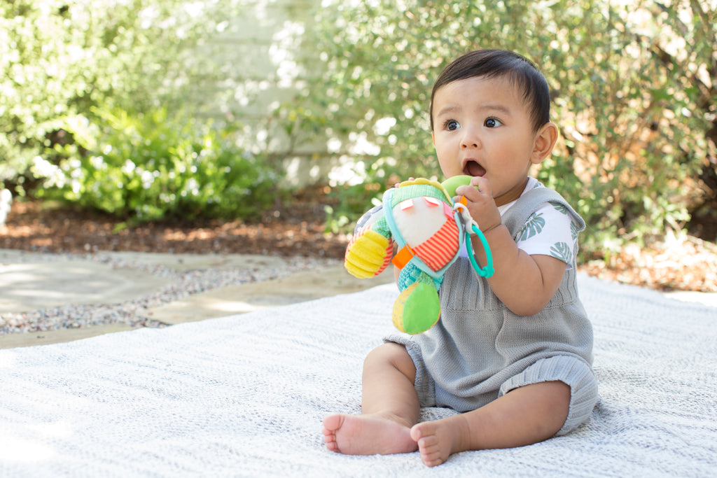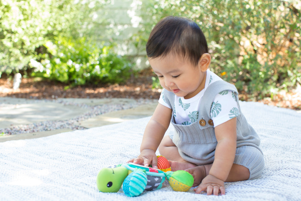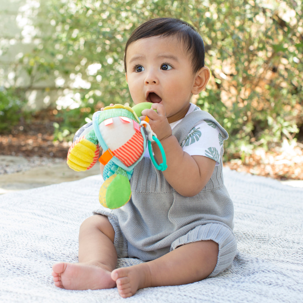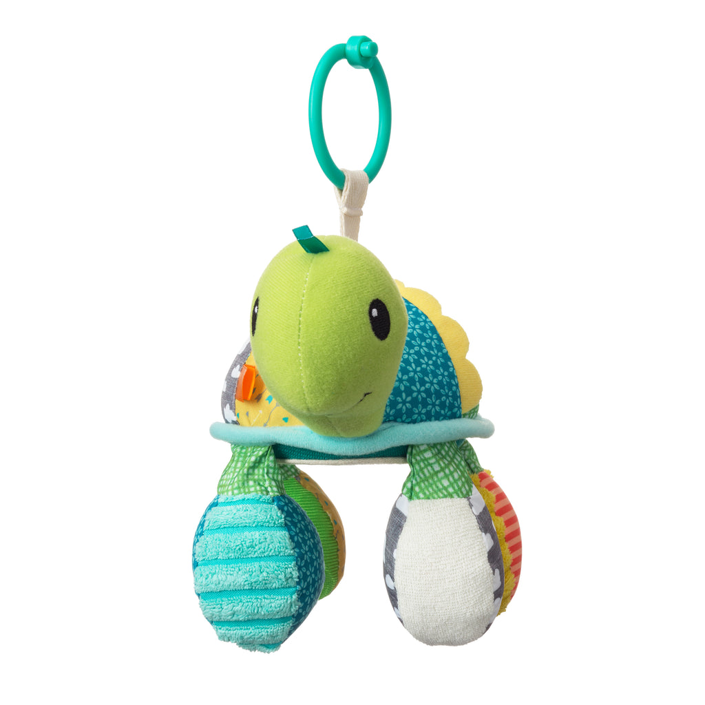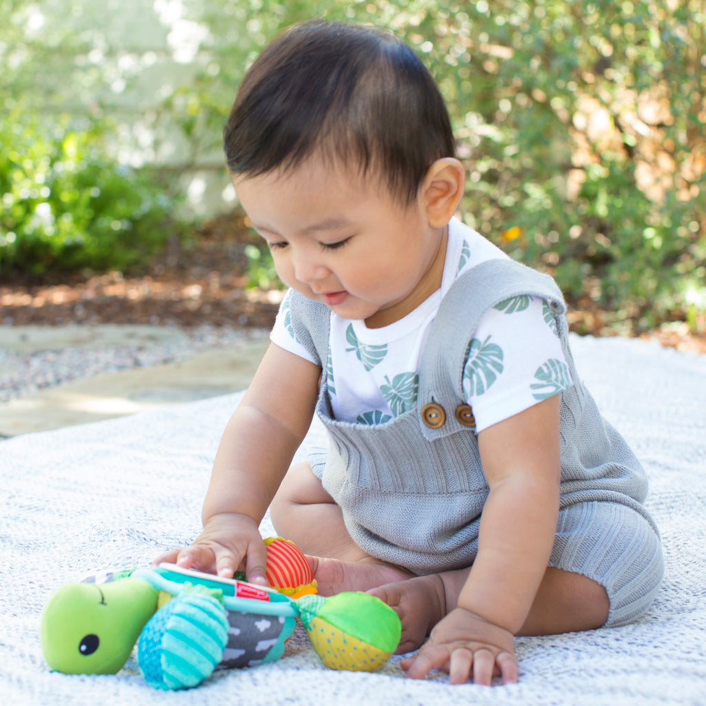 Babys werden von diesem verknüpfbaren Schildkrötenfreund mit lustigen Rasselgeräuschen, interessanten Texturen und einem verspiegelten Bauch zum Peek-a-Boo-Spiel begeistert sein.