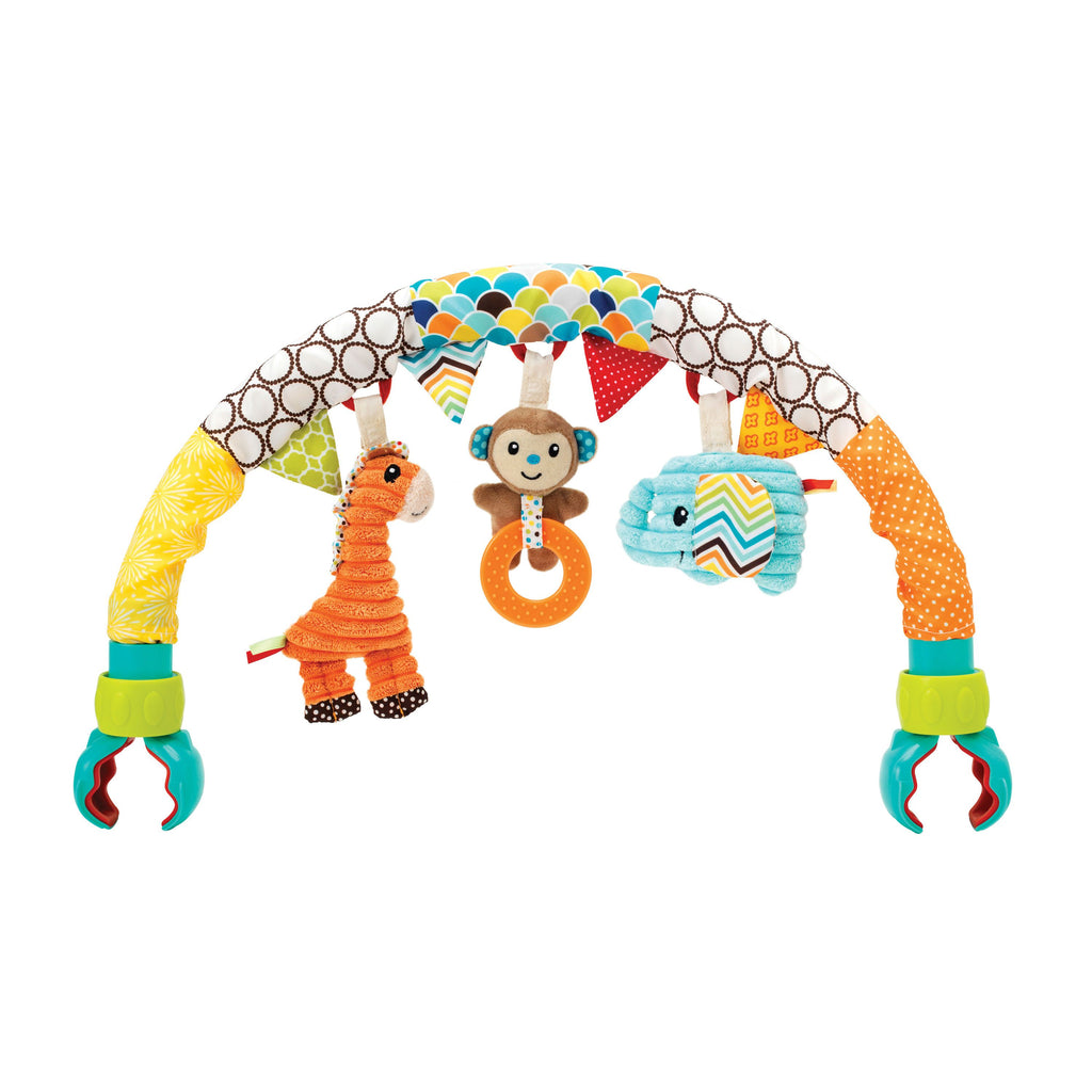 Dieser Bogen wird dein Baby überall zum Lachen bringen, egal wo ihr gerade seid. Denn dank der universellen Klemmen kann der Bogen an den meisten Kinderwagen und Autositzen befestigt werden. Es regt das Baby an, die drei süßen und bunten Stofffiguren (Elefant, Affe und Giraffe) zu betrachten, zu fangen und zu greifen. Der Affe hat zudem einen runden, weichen Beißring. Alle Charaktere sind für noch mehr Spaß sogar abnehmbar. Die Gesamtlänge des Bogens ist 65 cm.