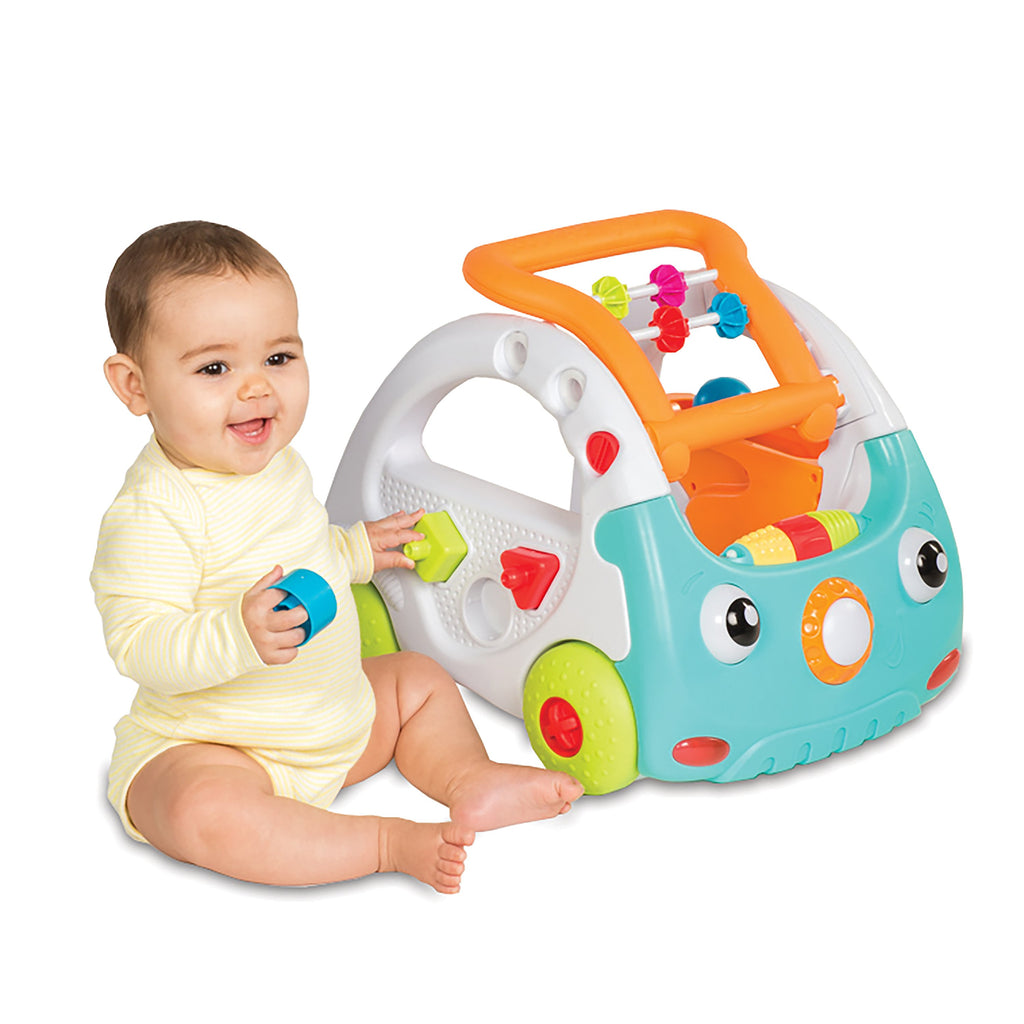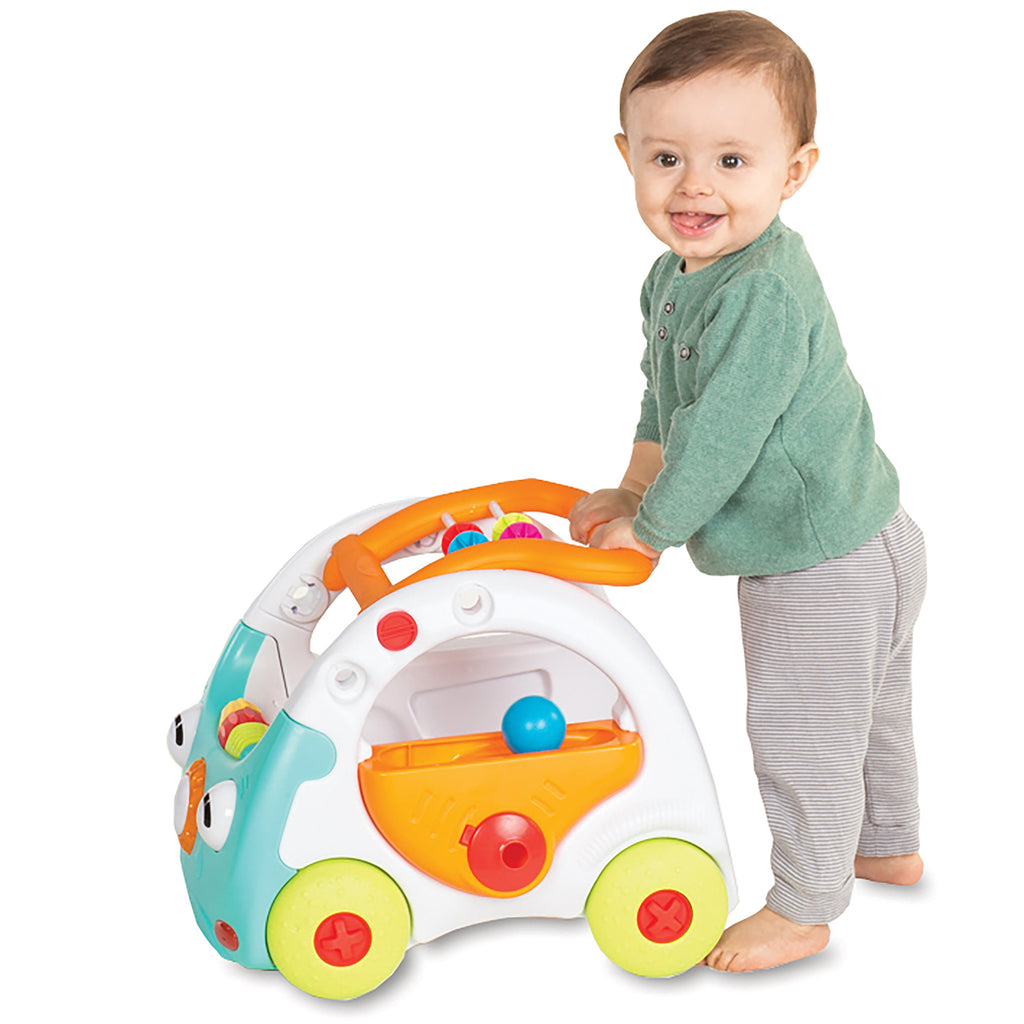 Dieses actiongeladene 3-in-1 Activity Entdecker-Auto eignet sich perfekt zum Sitzen, Stehen oder Spazierengehen! Bunte Knöpfe, blinkende Lichter, spannende Geräusche und eine Vielzahl von Texturen werden die Neugier deines kleinen Reisenden wecken. Das Auto bietet Gleitperlen, Formen sortieren und einen Ball Drop. Die Augen ändern sich und zwinkern. Drücke die Knöpfe, um die Scheinwerfer und Soundeffekte zu aktivieren.