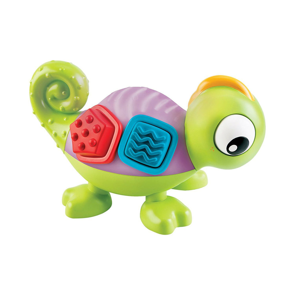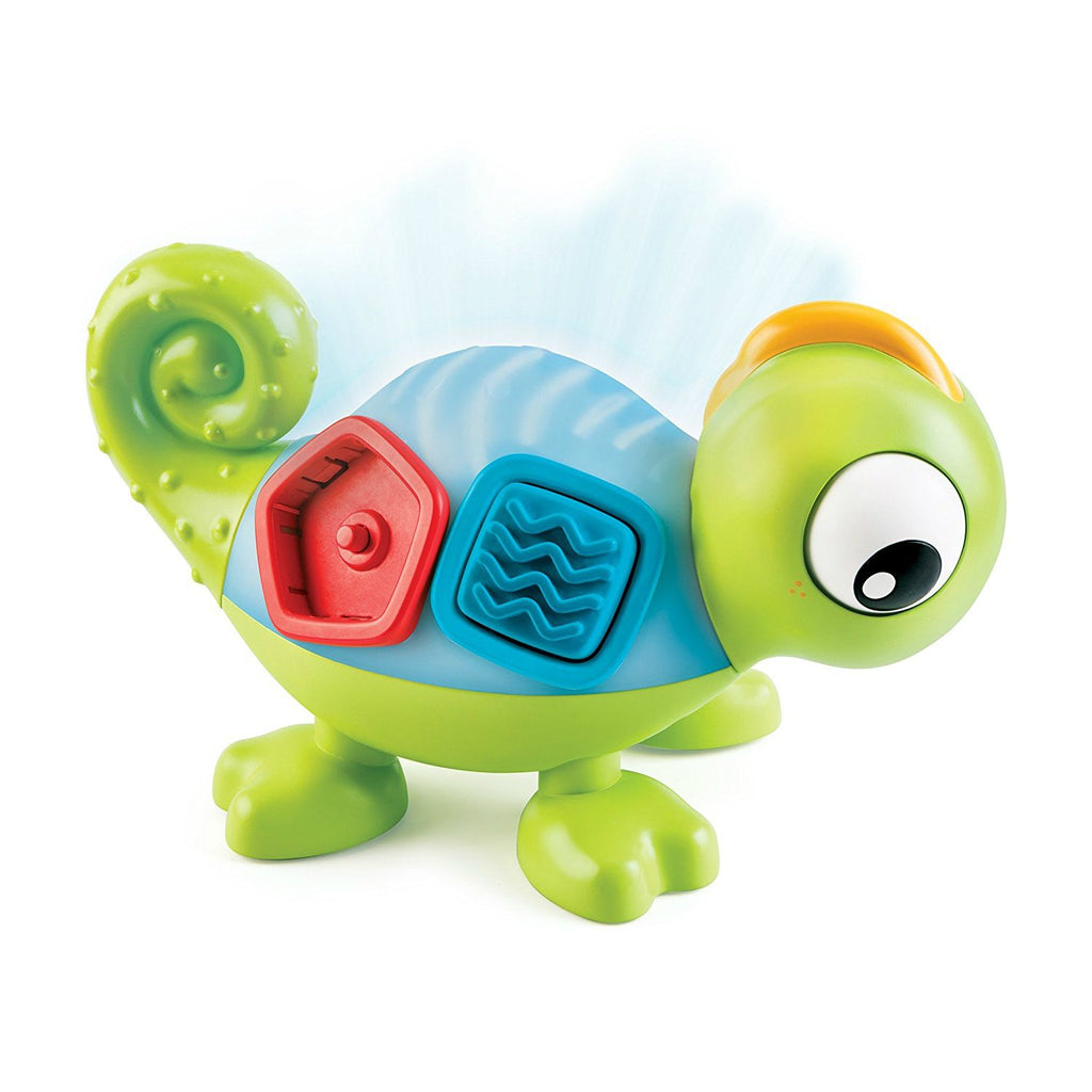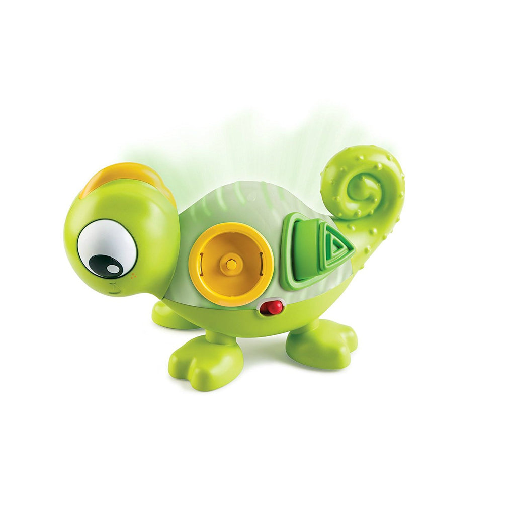 Mit diesem sprechenden Chamäleon lernt dein Baby, die 4 Formen unterschiedlicher Farben und Texturen in die entsprechenden Kästchen einzustecken. Sobald eine Form richtig positioniert ist, färbt sich das Chamäleon in der gleichen Farbe und benennt diese. Wenn eine weitere Form hinzugefügt wird, zum Beispiel rot und gelb, färbt sich das Chamäleon orange! Wenn alle Formen richtig eingesteckt sind, kann dein Baby auf den Rücken von Leon drücken und alle Steine fallen heraus und Leons Augen drehen sich. Leon spielt sehr schöne Melodien, die die ganze Familie bald mitsingen wird.
